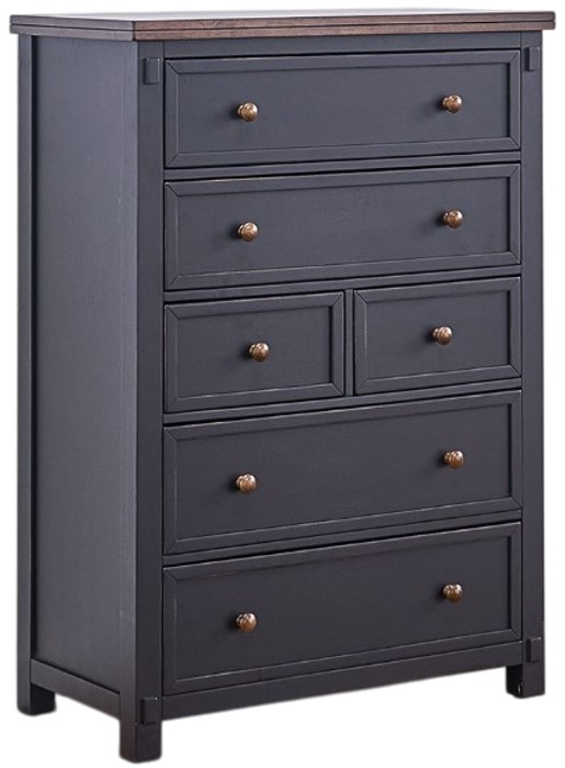 Stormy Ridge invites warm hospitality to the bedroom with its practical farmhouse style and generous footboard storage option. Simple elegance is achieved with classic moldings and coordinated wood hardware. Pronounced distressing in the chicory finish mimics the look of time-worn wood that is contrasted by the soft slate black paint.Read More