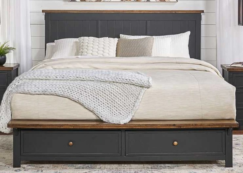 Stormy Ridge invites warm hospitality to the bedroom with its practical farmhouse style and generous footboard storage option. Simple elegance is achieved with classic moldings and coordinated wood hardware. Pronounced distressing in the chicory finish mimics the look of time-worn wood that is contrasted by the soft slate black paint.Read More