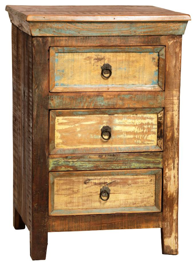 This collection is truly unique. No piece is exactly the same with this fun distressed reclaimed finish. Made from solid Mango hardwood, this storage nightstand features 3 verticle drawers. Each drawer is accented with antique bronze finished iron hardware. Colors, tones, and coverage will vary from piece to piece.Read More