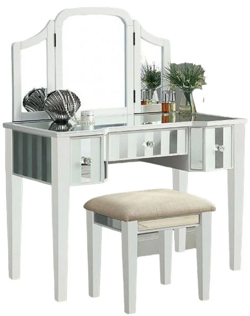 Vanities work best with large spaces. Big drawers for storage, a nice table top, multiple large mirrors for a full range of angles. Luckily this vanity features all of those. The mirrored paneling helps bring more light to your room and creates a shining beacon for you to follow and work at in the mornings. Sit at the matching padded stool and enjoy your prep time.Read More