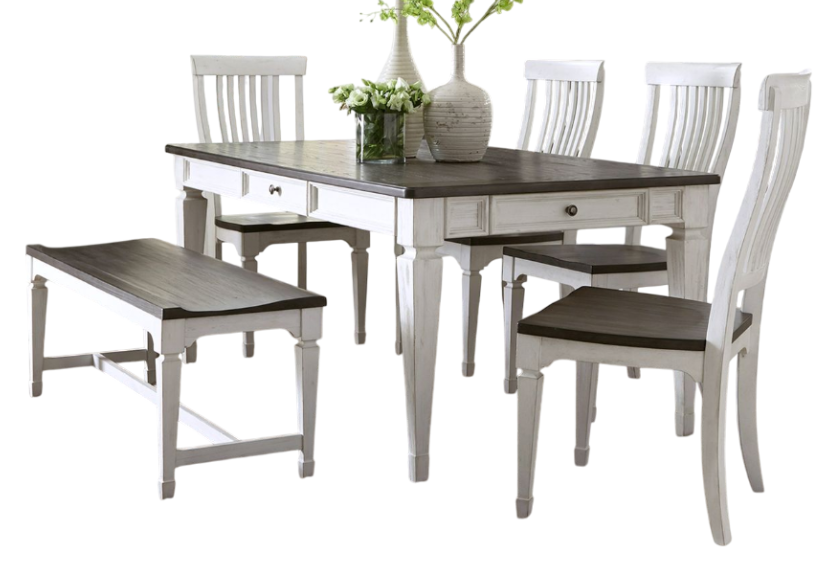 Sitting pretty with the Allyson Park six-piece rectangular table set. Crafted of pine solids and veneers with a cathedral white oak top, this set features wire brushed white finish and a wire brushed charcoal top.Read More