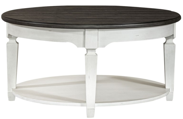 Enjoy family game night around the Allyson Park round cocktail table. Crafted of pine solids and veneers with cathedral white oak tops, this piece features a wire brushed white finish with a planked charcoal top, a bottom shelf for additional storage, casters for easy moveability, and anchored by square tapered legs.Read More