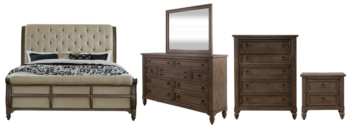 When details matter, choose the Americana Farmhouse queen sleigh bed, dresser, mirror, chest, and nightstand. Crafted of poplar solids with white oak veneers, this kit features a wire brushed dusty taupe finish with wormhole distressing, full extension drawers with wood framed drawer fronts, premium felt-lined top, and cedar lined bottom drawers, turned bun feet.Read More