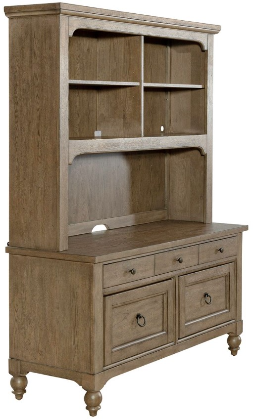 The credenza has a total of five full extension drawers including three top storage drawers and two wood framed file storage drawers. The hutch features wire management provisions and includes to fixed shelves and two adjustable shelves for display and storage. Americana Farmhouse evokes a style unconstrained and intended to be personal with an authentic craftsman’s flair and artistry.