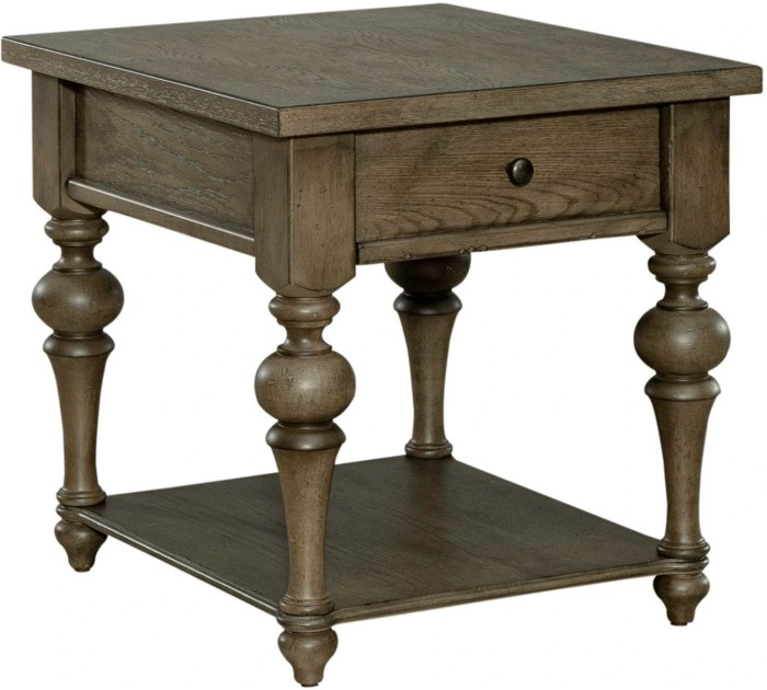 Functional and fashionable is the America Farmhouse end table. Crafted of poplar and rubberwood solids and white oak veneers with a dusty taupe finish. Features one full extension drawer for remotes or magazines, a bottom shelf for additional storage and heavy turned legs with tulip feet. Perfect beside your favorite chair or sofa.Read More