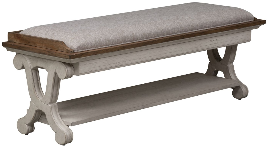 Complete your cottage look with this upholstered bed bench. The chestnut colored gallery top is accented by the beige polyester cushion. Decorative "X" end panels are highlighted by the antique white finish with heavy wire brush and distressing. Extra storage is added thanks to the bottom shelf.Read More