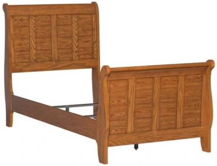 Staple any room with this rustic American style sleigh bed. Constructed of rubberwood solids and oak veneers, this piece features an aged oak finish, scrolled headboard and footboard, horizontal planked design on headboard and footboard, center slat supports, and a bolt on rail system.Read More