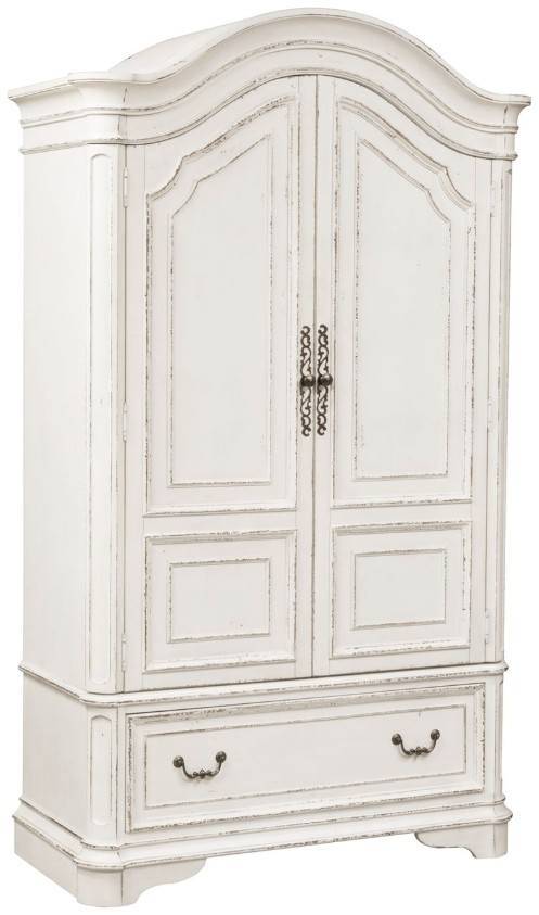 Accent your bedroom with the perfect blend of European traditional design, using this unique and stylish armoire. The all over antique white finish accompanied by heavy chipping sets this piece apart from the rest of the collection. Two beautiful wrap around doors open to reveal a multi-functional space, including removable shelves and a clothing rail.Read More