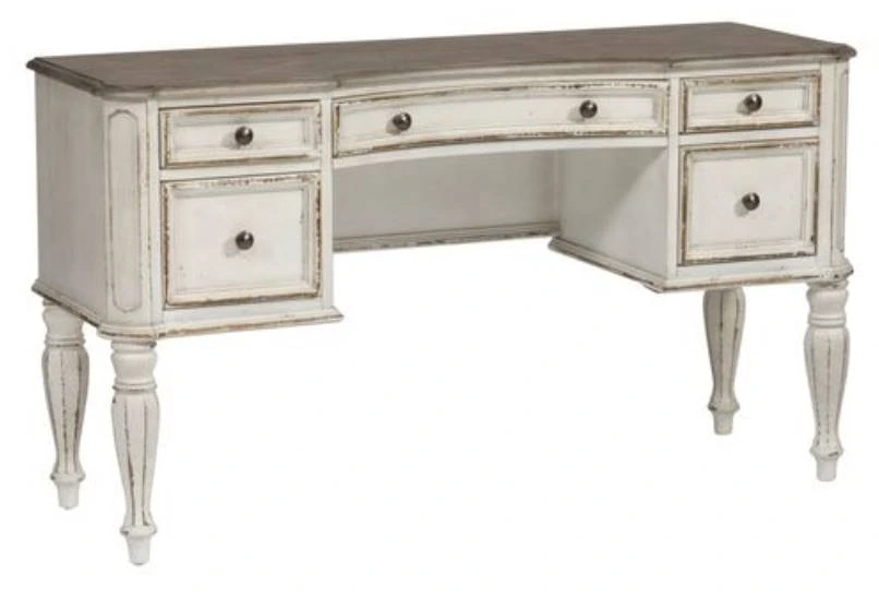 Start your mornings off by utilizing this charming vanity desk. The weathered brown whitewash top paired with the antique white finish and antique pewter knob hardware creates a truly unique look.Read More