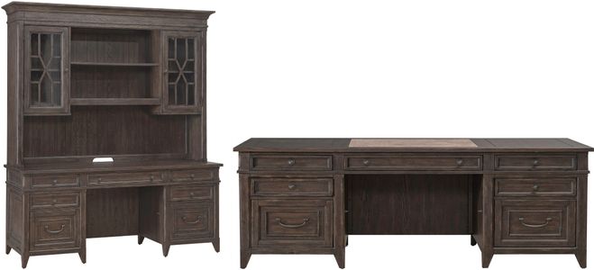 Enhance your office with this elegant Liberty Furniture Paradise Valley 5-Piece Saddle Brown Executive Set. Featuring a spacious desk, credenza & hutch, and ample storage, it combines style and functionality. Crafted for productivity and comfort, it's perfect for creating a professional and polished workspace.Read More