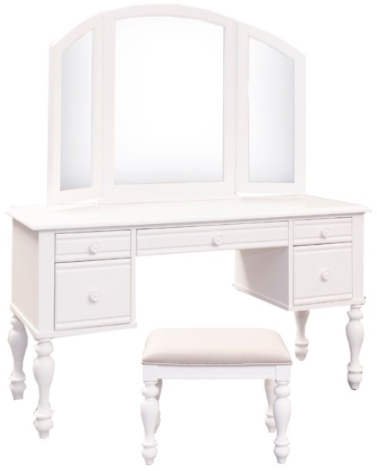 Live life beautifully with the Summer House I vanity desk, mirror, and stool. Crafted of poplar and pine solids this kit features an oyster white finish, bead molding, full extension drawers with felt lined top drawers, turned legs, and is accented with wooden knob hardware.Read More