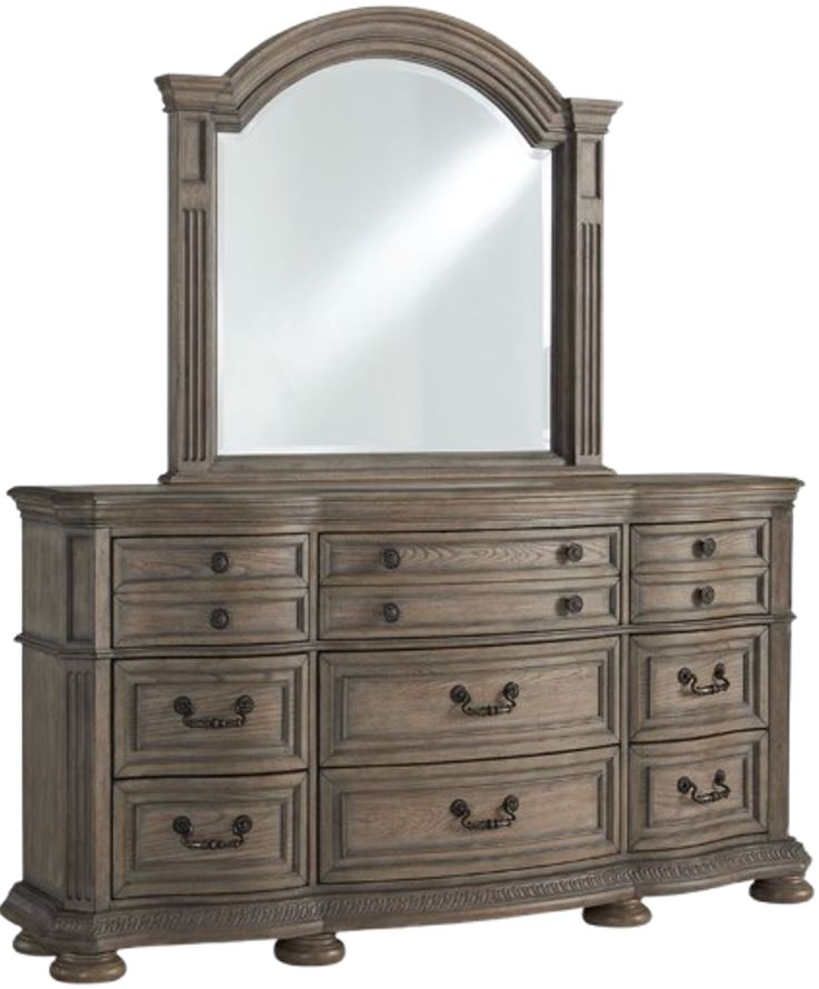 Merging traditional elegance with modern comfort, this dresser with mirror takes your bedroom retreat to the next level. Serpentine curves, thick profiled tops and a glazed antiqued-look finish radiate timeless sophistication. Drawers of various sizes are packed with ample storage possibilities.Read More