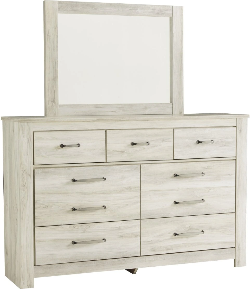 Your bedroom isn’t just a room. It’s a canvas. Express your farmhouse style with this dresser and mirror set. Wispy white finish over replicated oak wood grain brightens up the space with charm. Brushed nickel-tone handles with black edging finesse the piece with a bit of shine.Read More