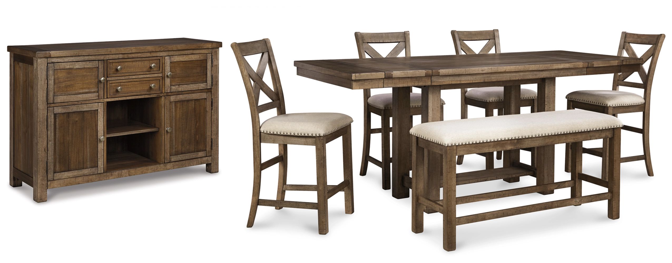 This counter height dining table set with upholstered bar stools, upholstered bench and server elevates the art of casual rustic style. Notable refinements include through-tenon touches, plank-effect tabletop and distressed nutmeg finish that’s warm and welcoming.Read More