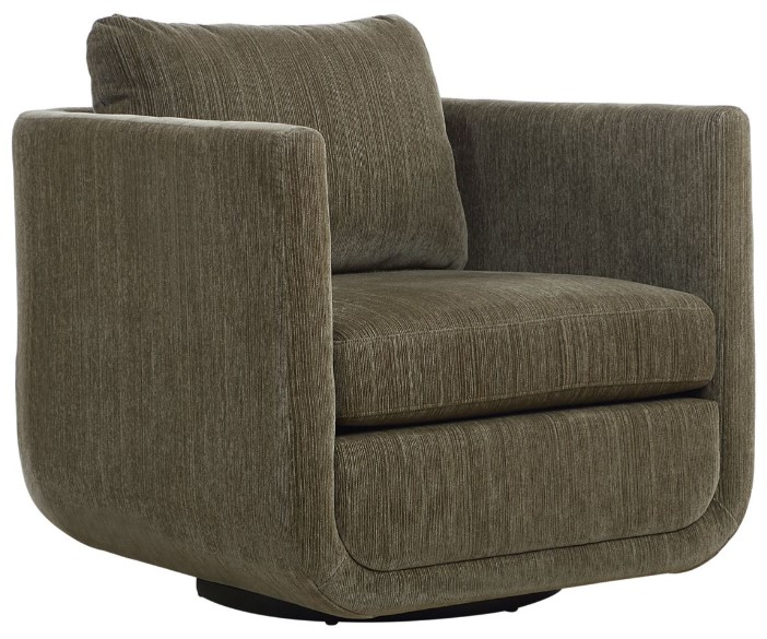 Curves abound creating style and ease, featuring a rounded frame that cradles the base and rests on a hidden swivel. Fully upholstered in a rich textured chenille in a herb.Read More
