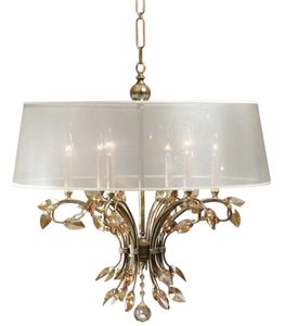 Burnished gold metal with golden teak crystal leaves and a silken champagne sheer fabric shade.Read More