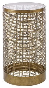 Greek key inspired elements elevate this slender drum table design in lightly antiqued gold finished iron, topped with clear glass.Read More