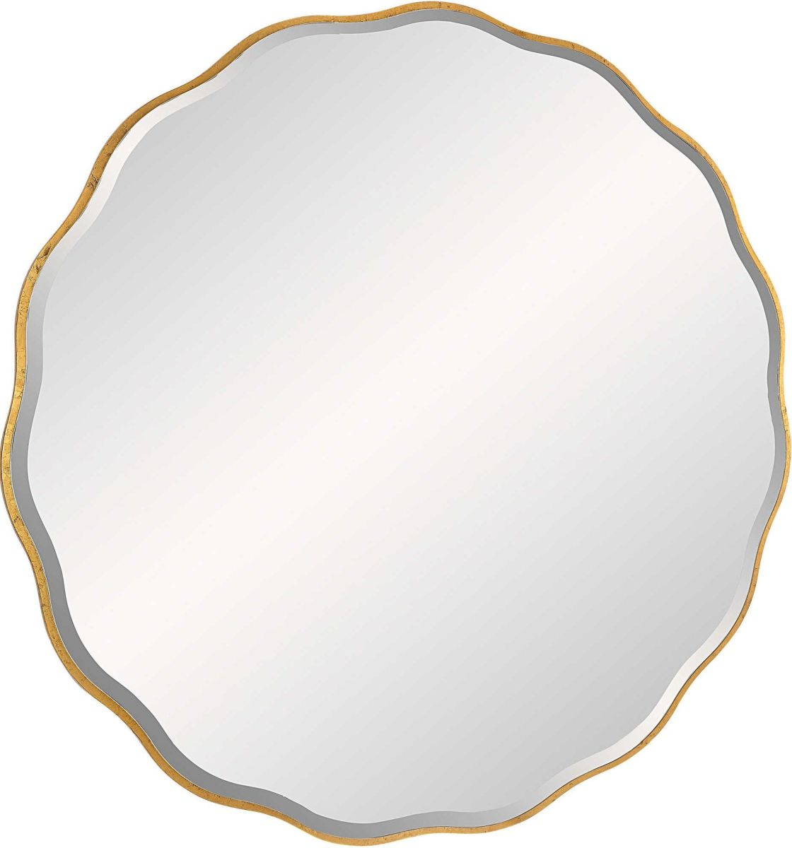 Showcasing an impressive scale and a feminine scalloped edge, this shaped wood mirror adds whimsical flair to any design. The mirror is finished in aged gold and has a 1" bevel.Read More