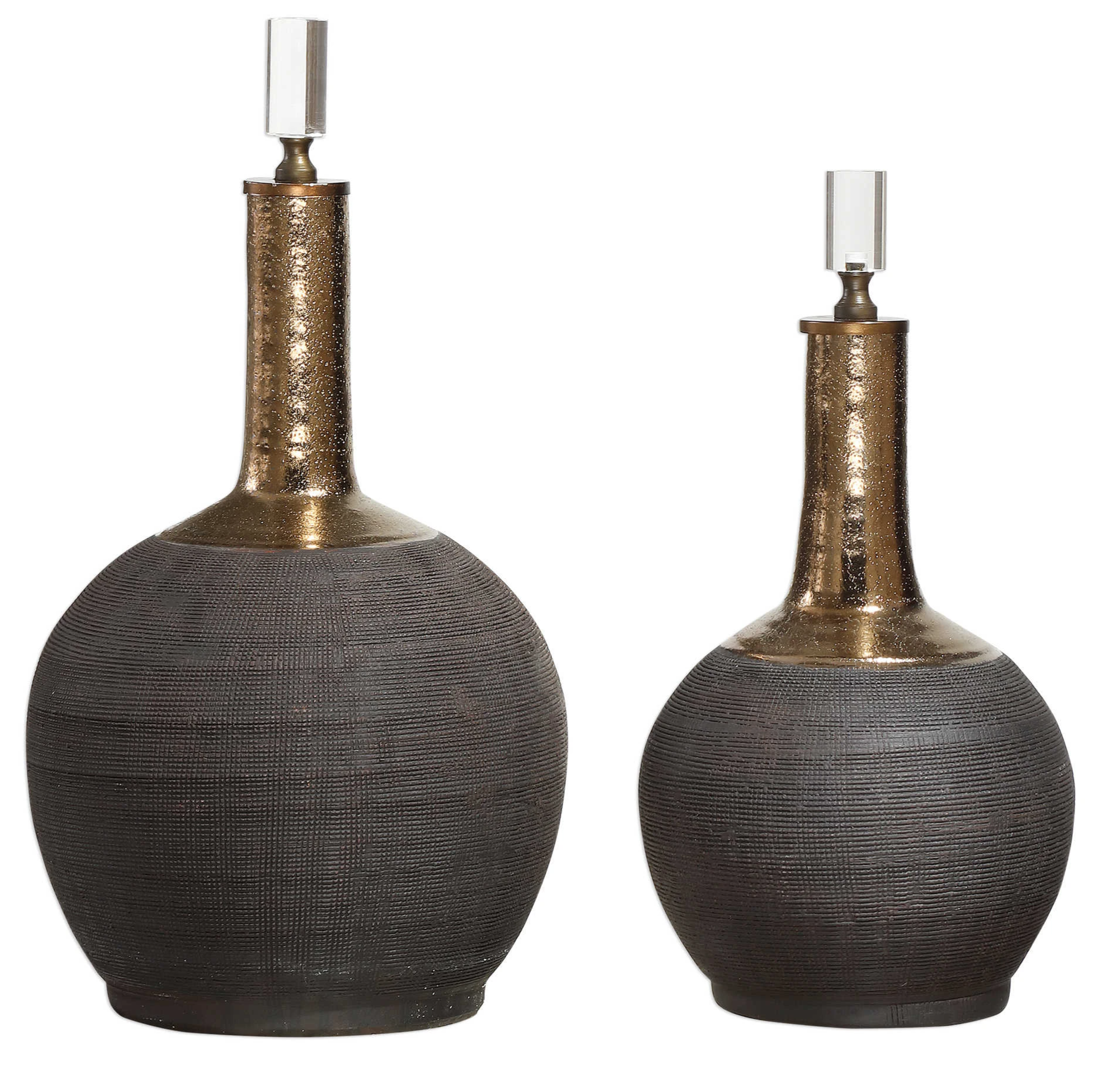 Ceramic bottles, with matte black hand-scored bodies, golden metallic glazed necks, and shaped crystal finials. Sizes: Sm-7x14x7, Lg-9x16x9