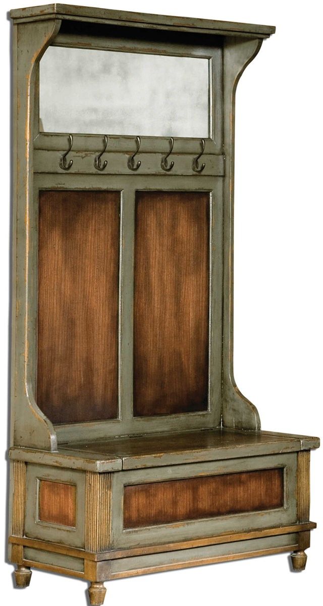 Honey stained, solid mahogany wood with hand painted, distressed charcoal gray accents, aged brass coat hooks and antiqued mirror. Seat lifts with safety hinge for storage.Read More