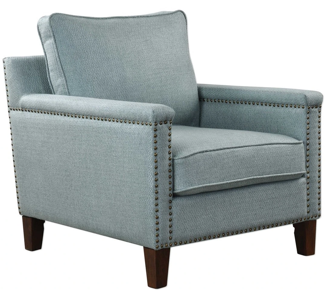 Supportive comfort in a transitional club chair, with a subtle woven argyle pattern in light sea mist, accented with antique brass nail head trim on solid oak legs finished in dark walnut. Seat height is 17".