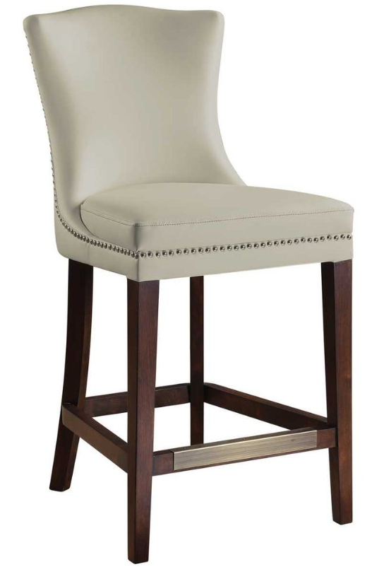 Sleek styling with a gently curved back, featuring soft faux leather in a cream white, with hand hammered polished nickel nail head trim. Birch wood frame is finished in a rich dark walnut stain with an antique bronze kick plate. Seat height is 26".