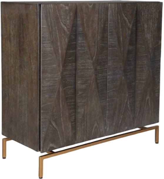 This cabinet features geometric door fronts and is crafted of ebony cerused mindi veneer. The rich wood tones are complemented by a sleek gold plated base, adding a contemporary flair to this piece.Read More
